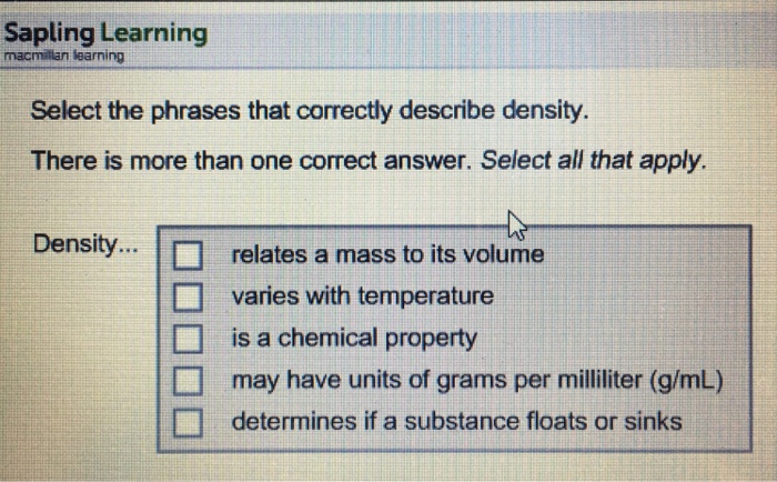 Select The Phrases That Correctly Describe Density There Is More Than One Correct Answer Select All Brainly Com